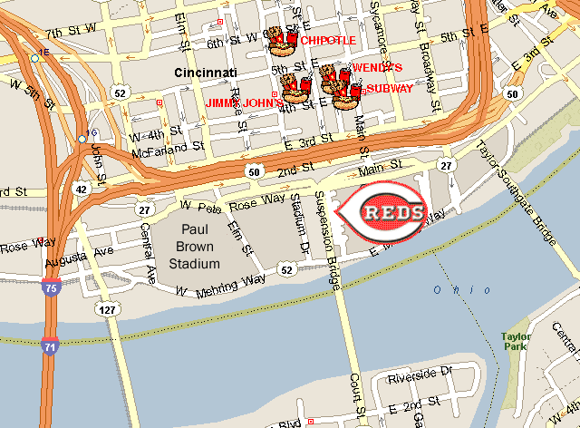 The hours required to work in media relations are often very demanding, especially during the season.  The downtown location of Great American Ball Park makes it easy to get food on the go and bring it back to the ballpark.  All the places listed below are within walking distance of the ballpark and part of my regular rotation.