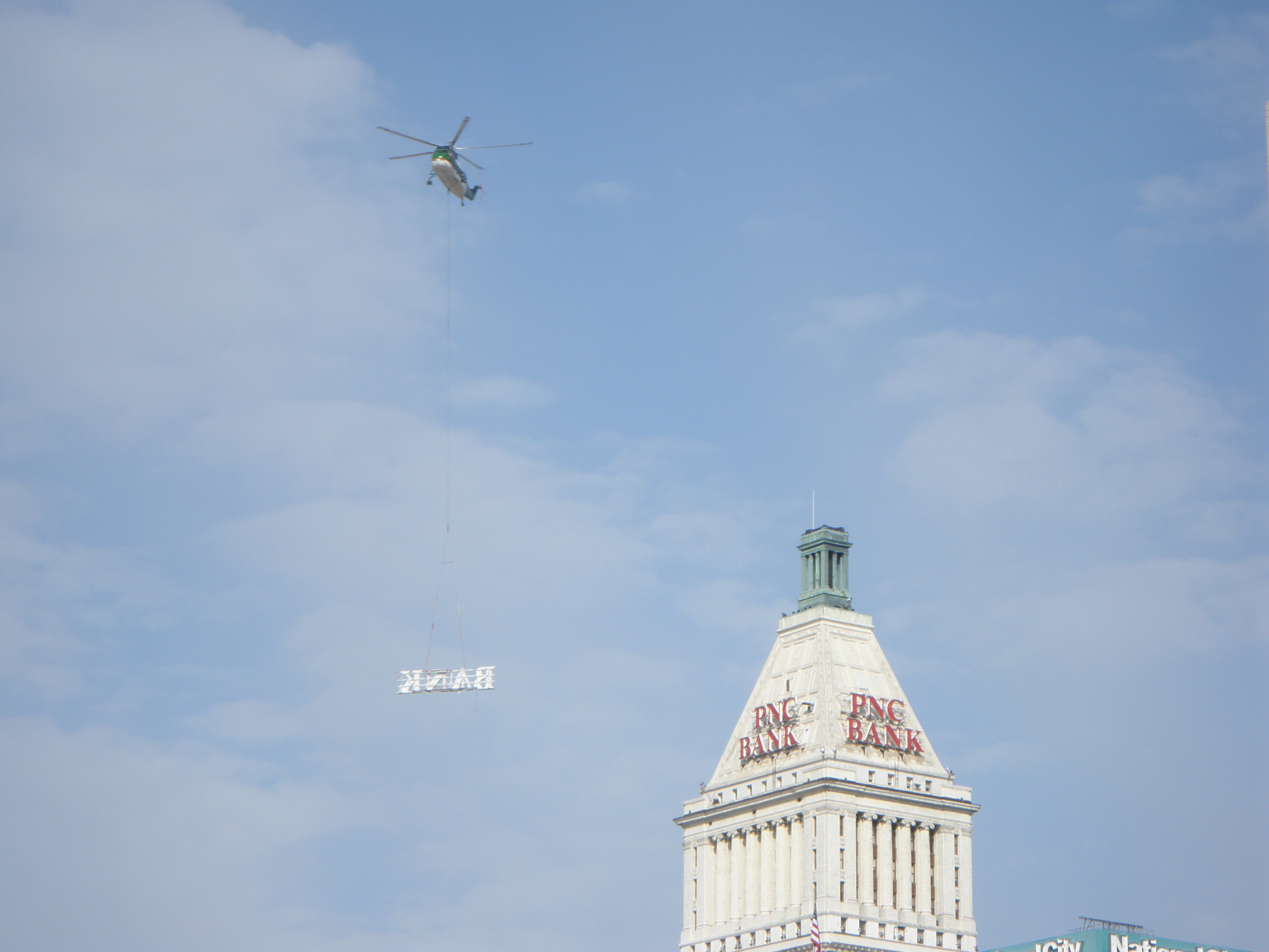 On Saturday, the PNC Bank Tower got a bit of face-lift. The sign sitting atop the structure was updated to the current logo with the use of a helicopter. Although not baseball or team related, I thought it was still pretty cool and snapped a few pictures of the action from downtown and from the ballpark.