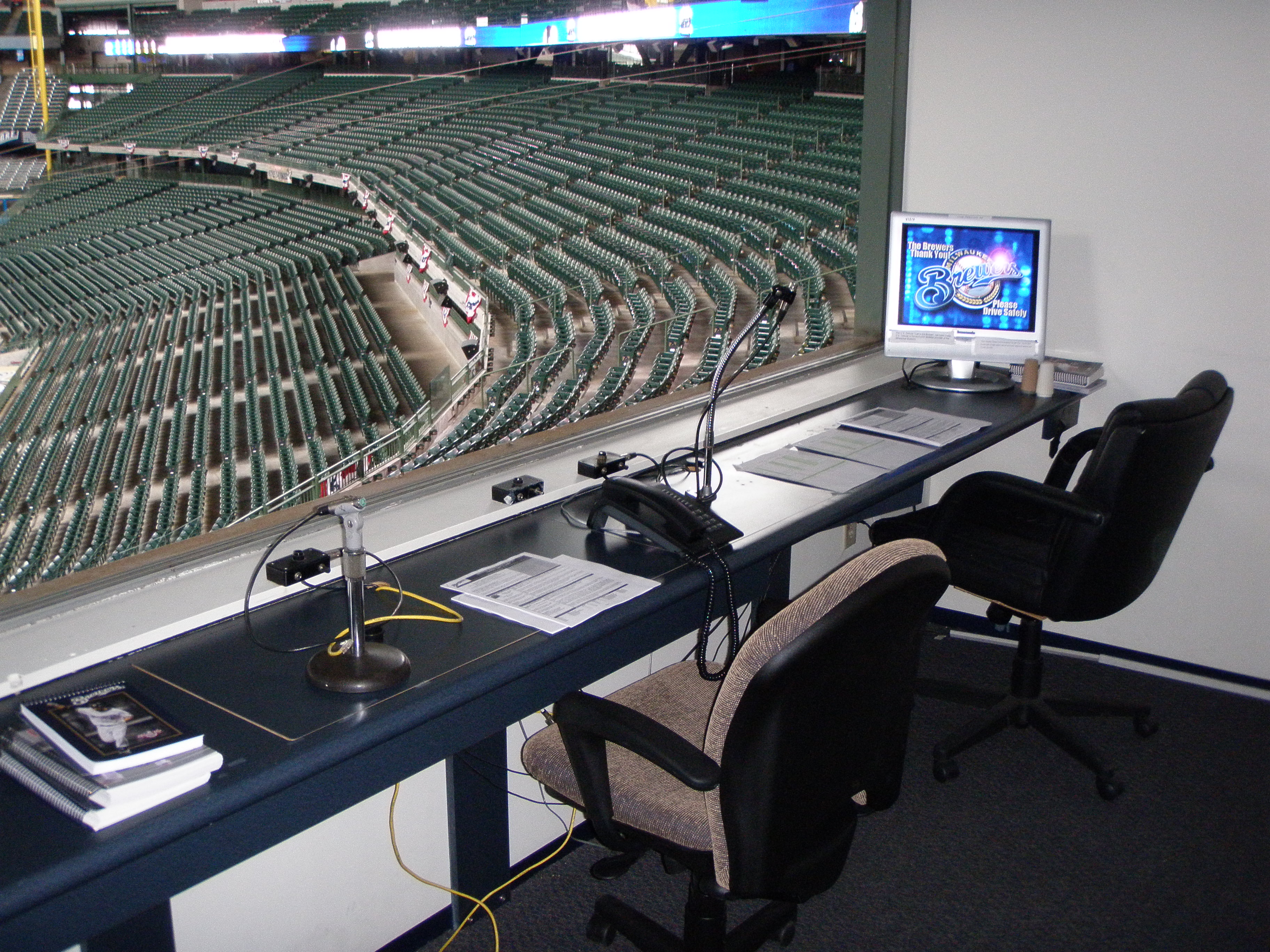 Seen here on the far right is the seat of Hall of Fame radio broadcaster Bob Uecker. He was sitting there earlier, but he had to “Get up, get up, get outta here, gone!”