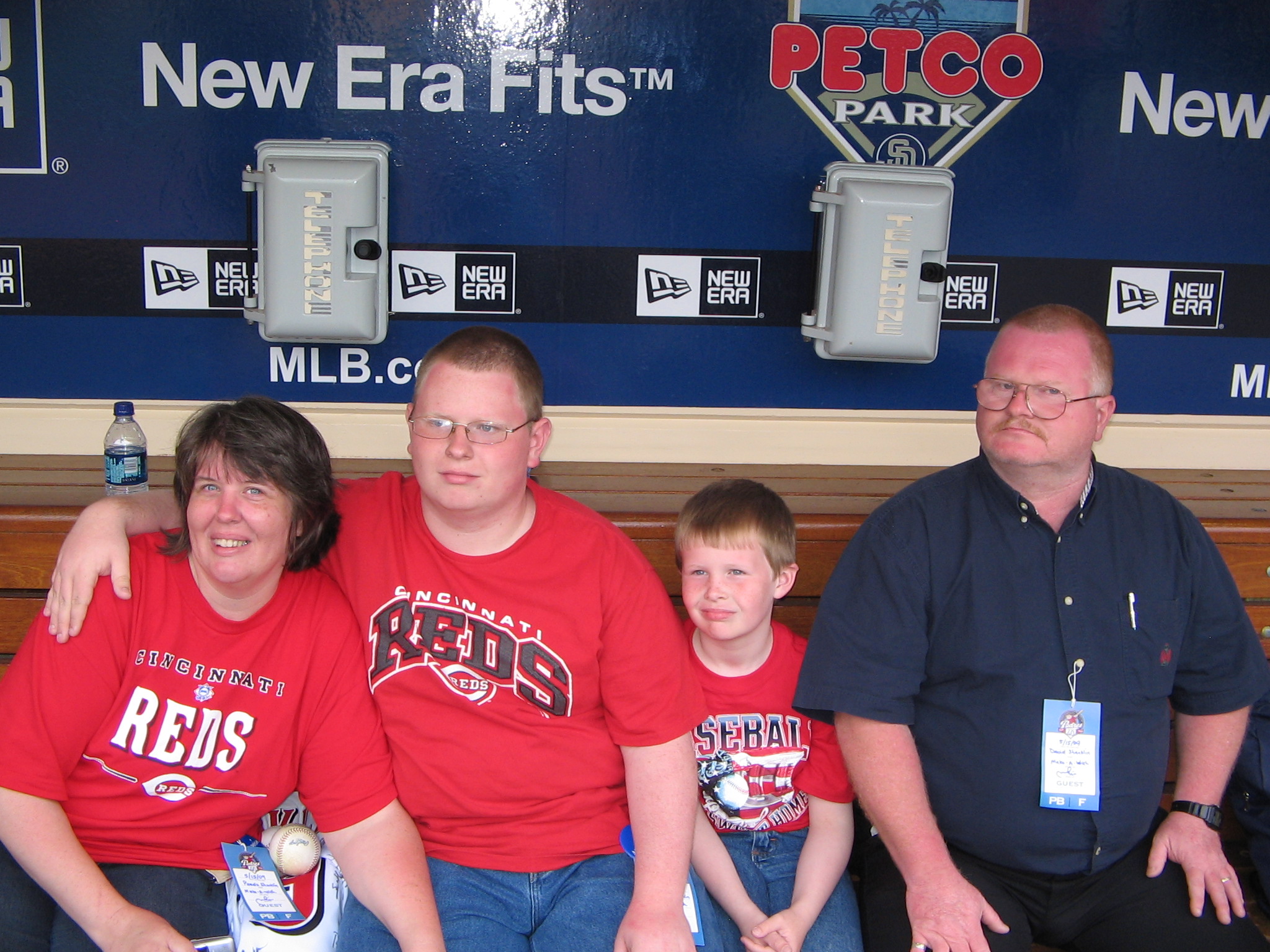Seated here in the dugout at Petco Park is Garth’s family, from left to right, mother Pamela, Garth, brother Timmy and father David.