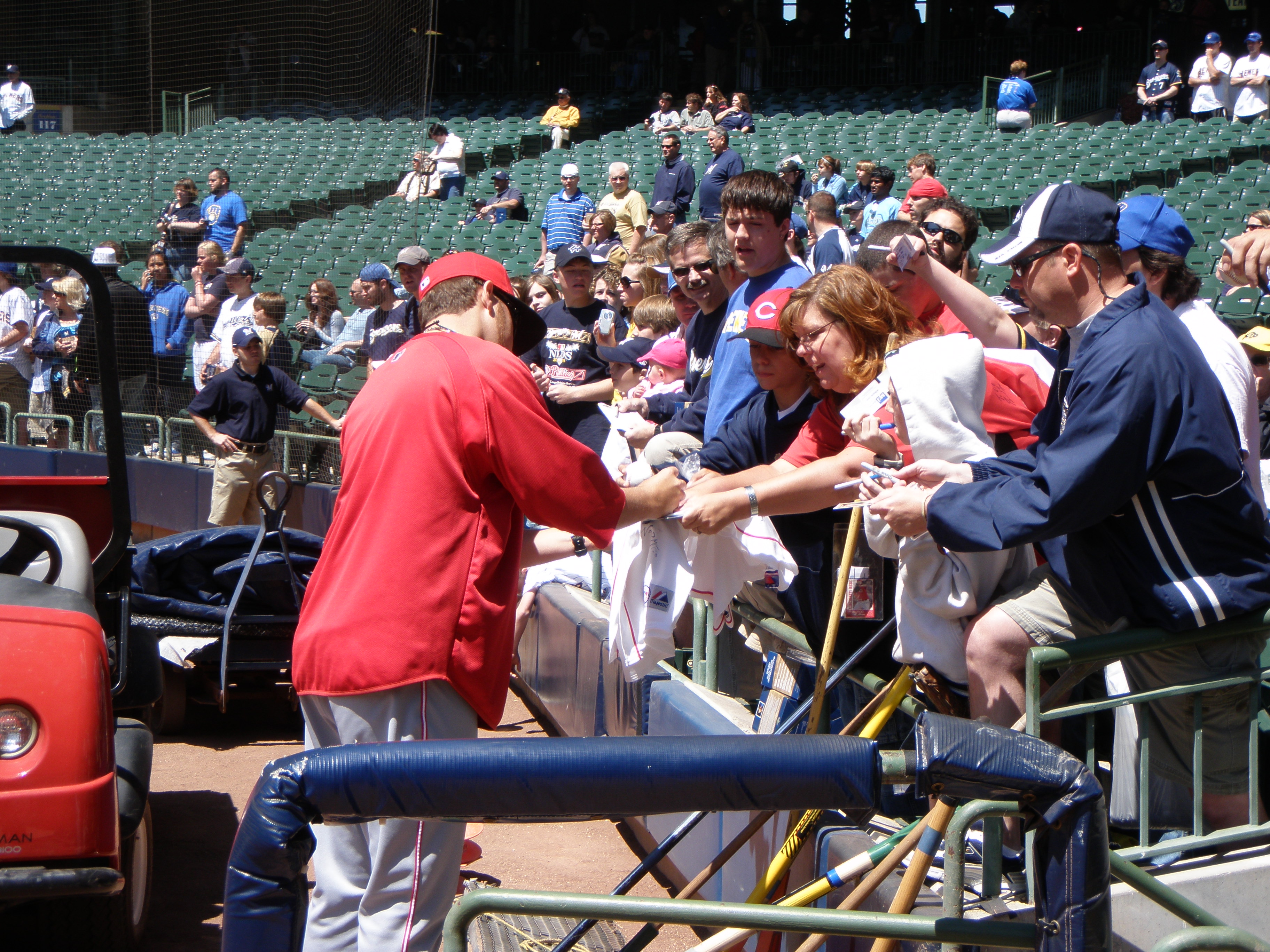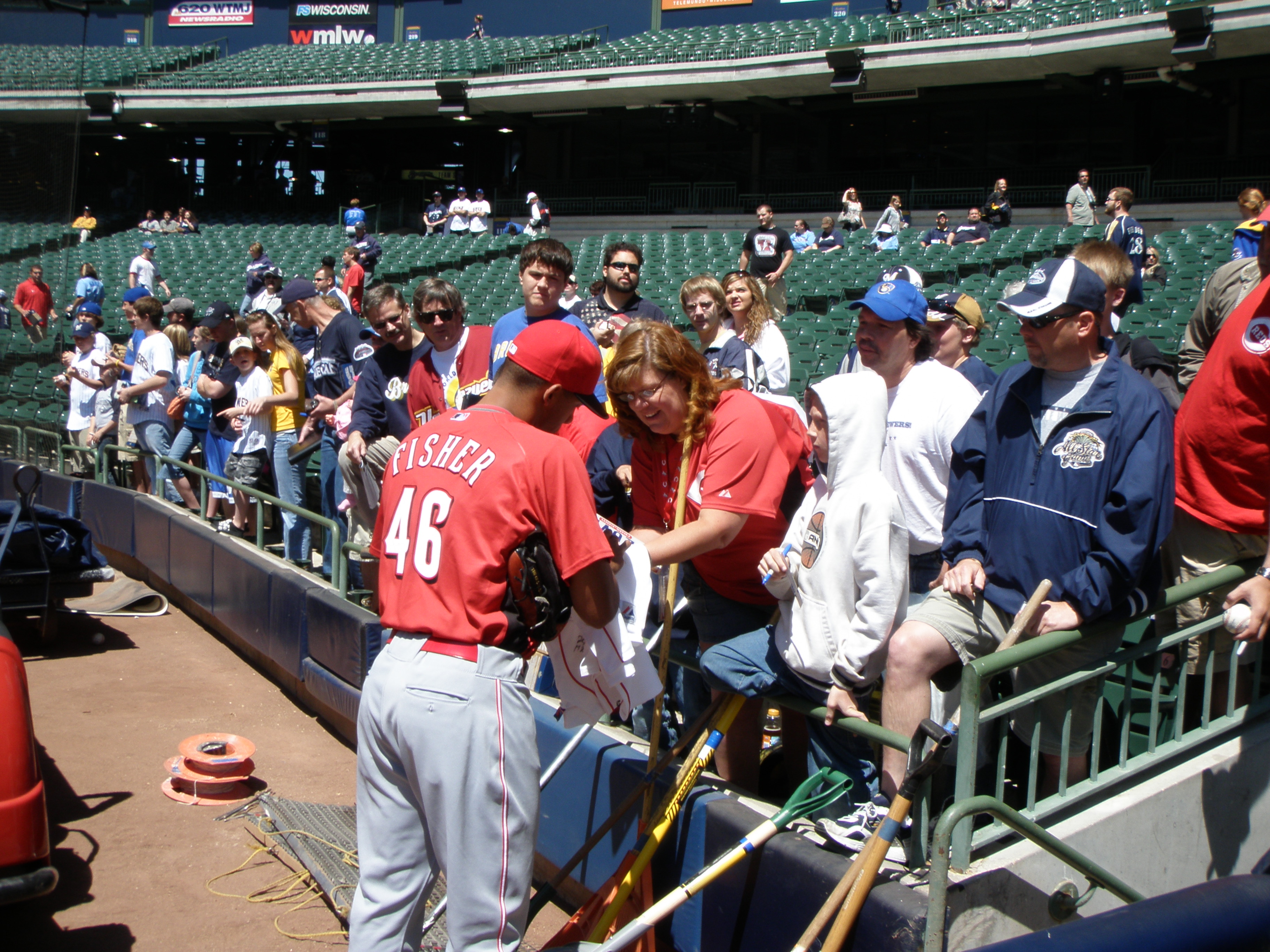 RHP Carlos Fisher and RHP Aaron Harang found some Reds fans in the sellout crowds of Milwaukee and signed a few autographs.