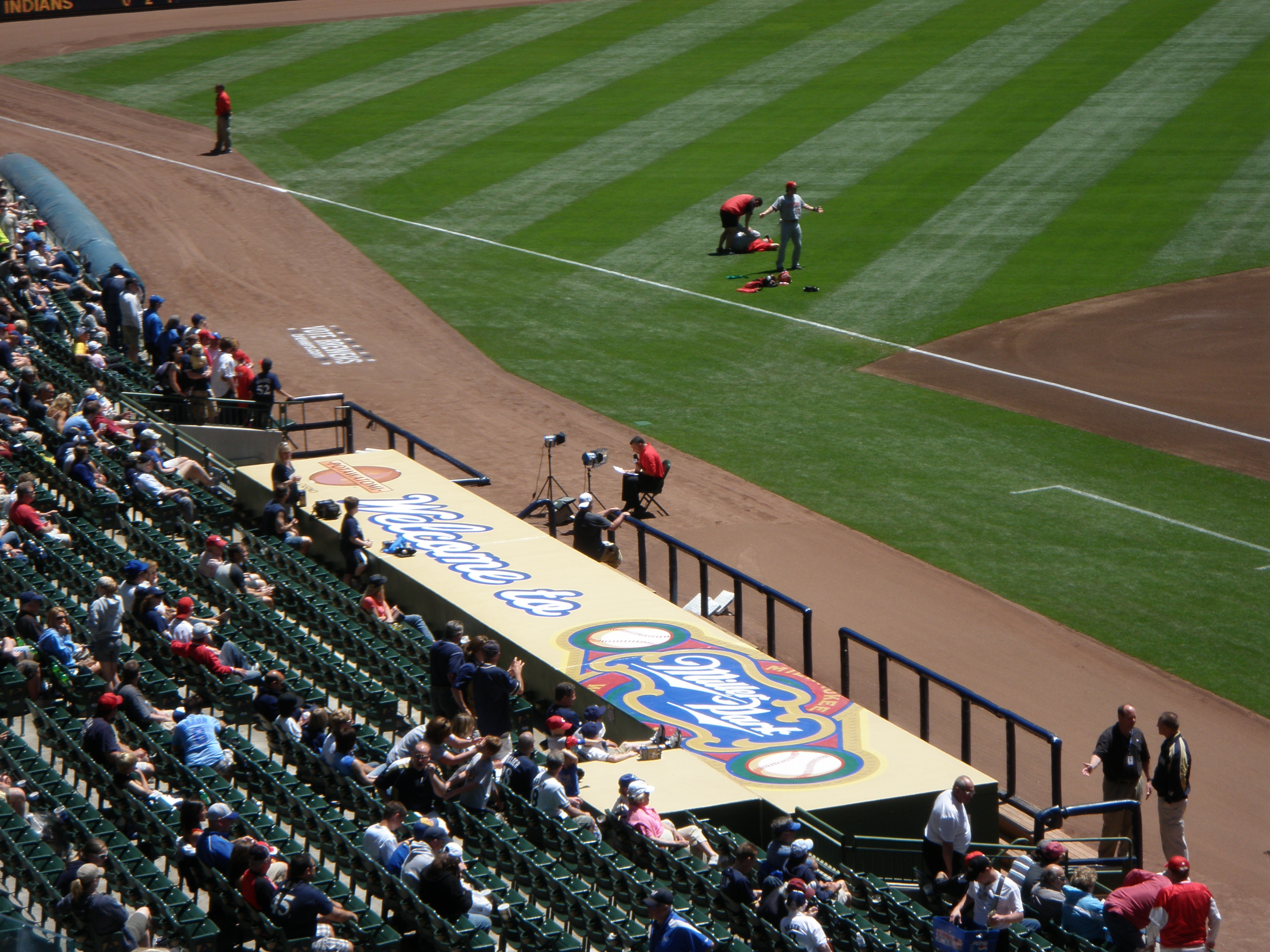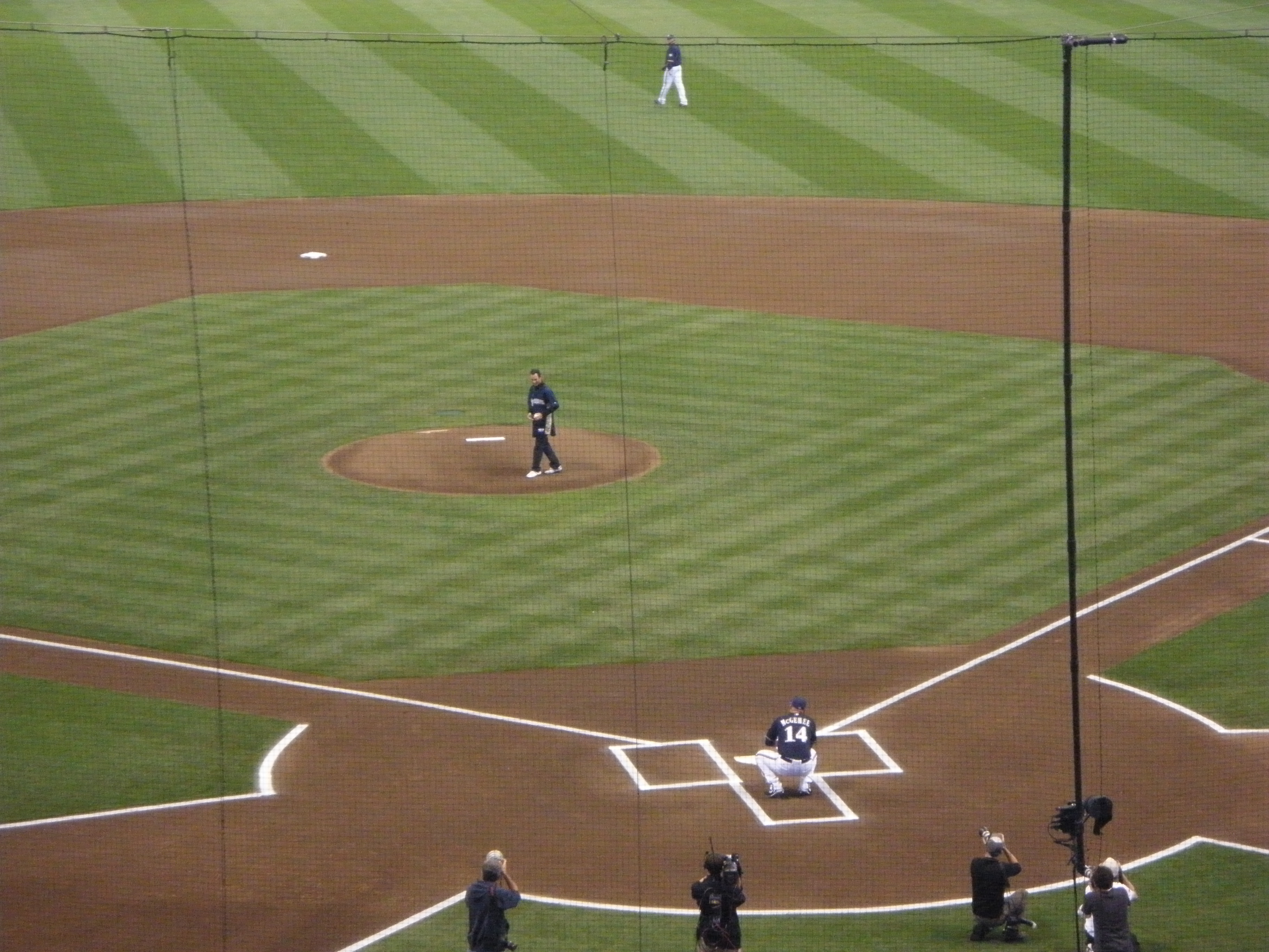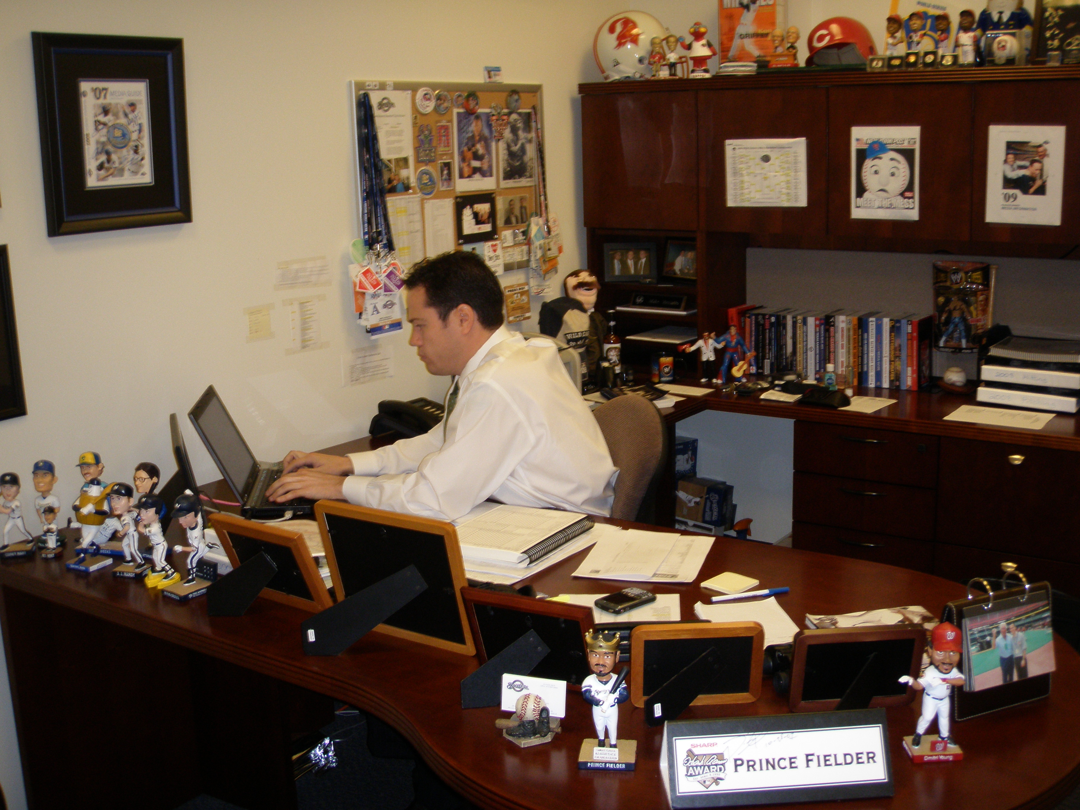 This is Brewers director of media relations Mike Vassallo hard at work in his office before Sunday’s game. Before going to work for the Brewers, Mike served as assistant director of media relations for the Reds. He was my boss when I was in Milwaukee and made the move to Cincinnati happen for me. Also, you know that you’ve “made it” when your picture or bobblehead ends up on his desk or wall.