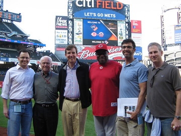 Jonathan Hoffman of Manhattan, second from right, won an auction that helped raise money for Tony LaRussa’s Animal Rescue Foundation. Hoffman’s group is shown here with Reds general manager Walt Jocketty, second from left, and field manager Dusty Baker, third from right, before last night’s game against the Mets at new Citi Field.