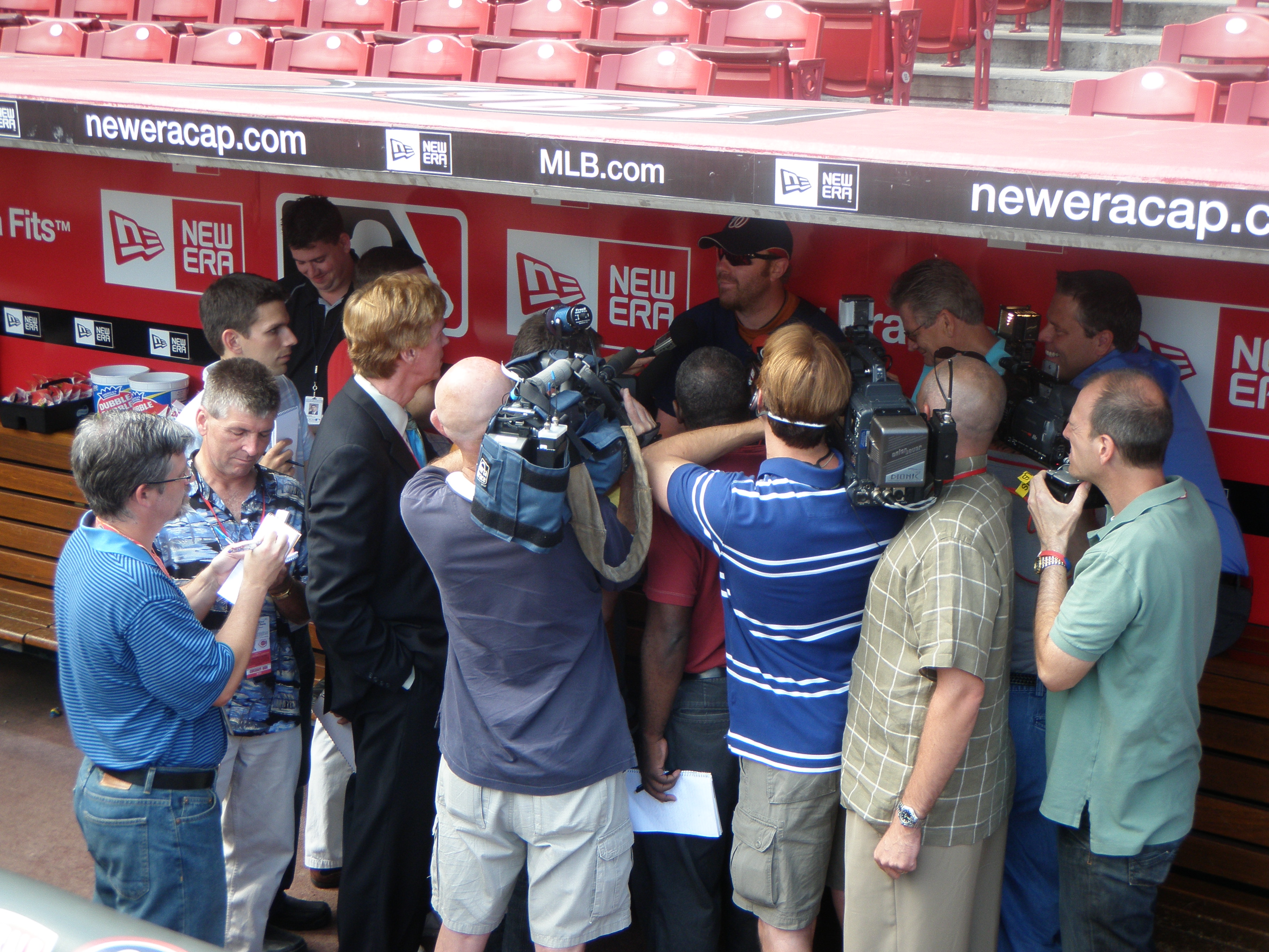 Washington Nationals OF Adam Dunn is seen here addressing the local media during his return to Great American Ball Park. Dunn has 124 career home runs at GABP.