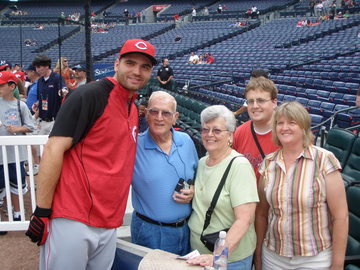 Reds first baseman Joey Votto is shown with Jack LeMasters and his family prior to Saturday’s game against the Braves at Turner Field in Atlanta. As a 4-year-old, Jack attended his first Reds game 75 years ago at Crosley Field in Cincinnati. The family now lives in Atlanta.