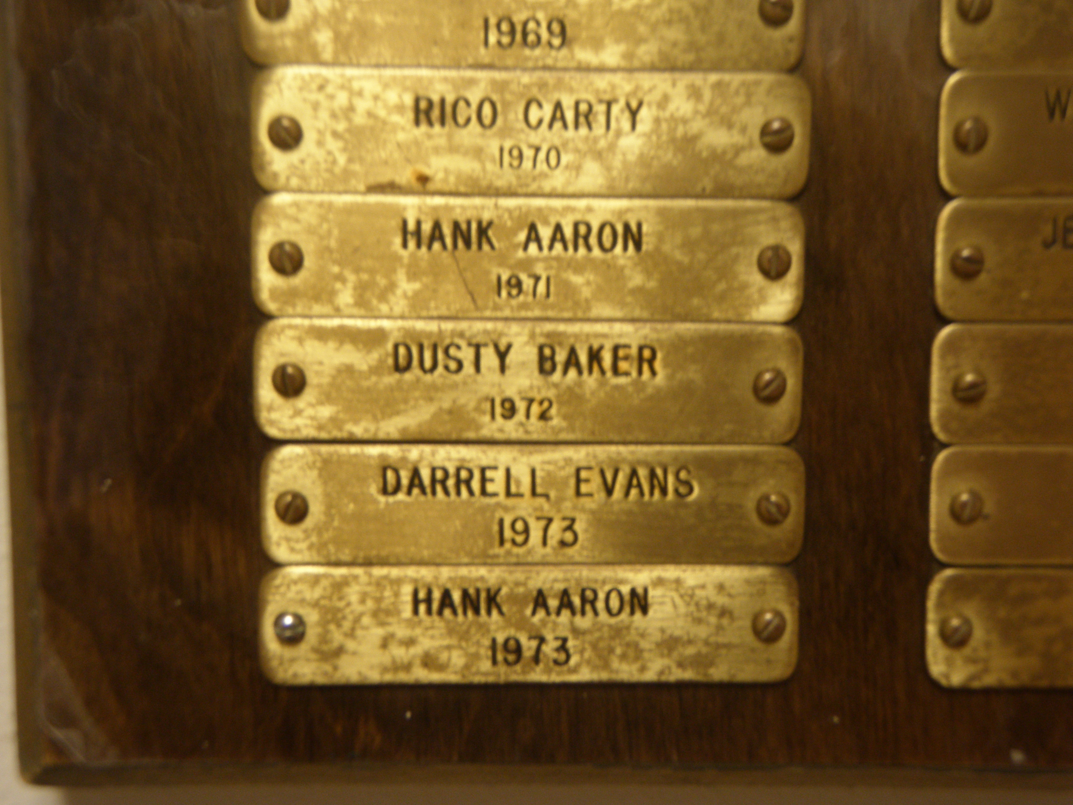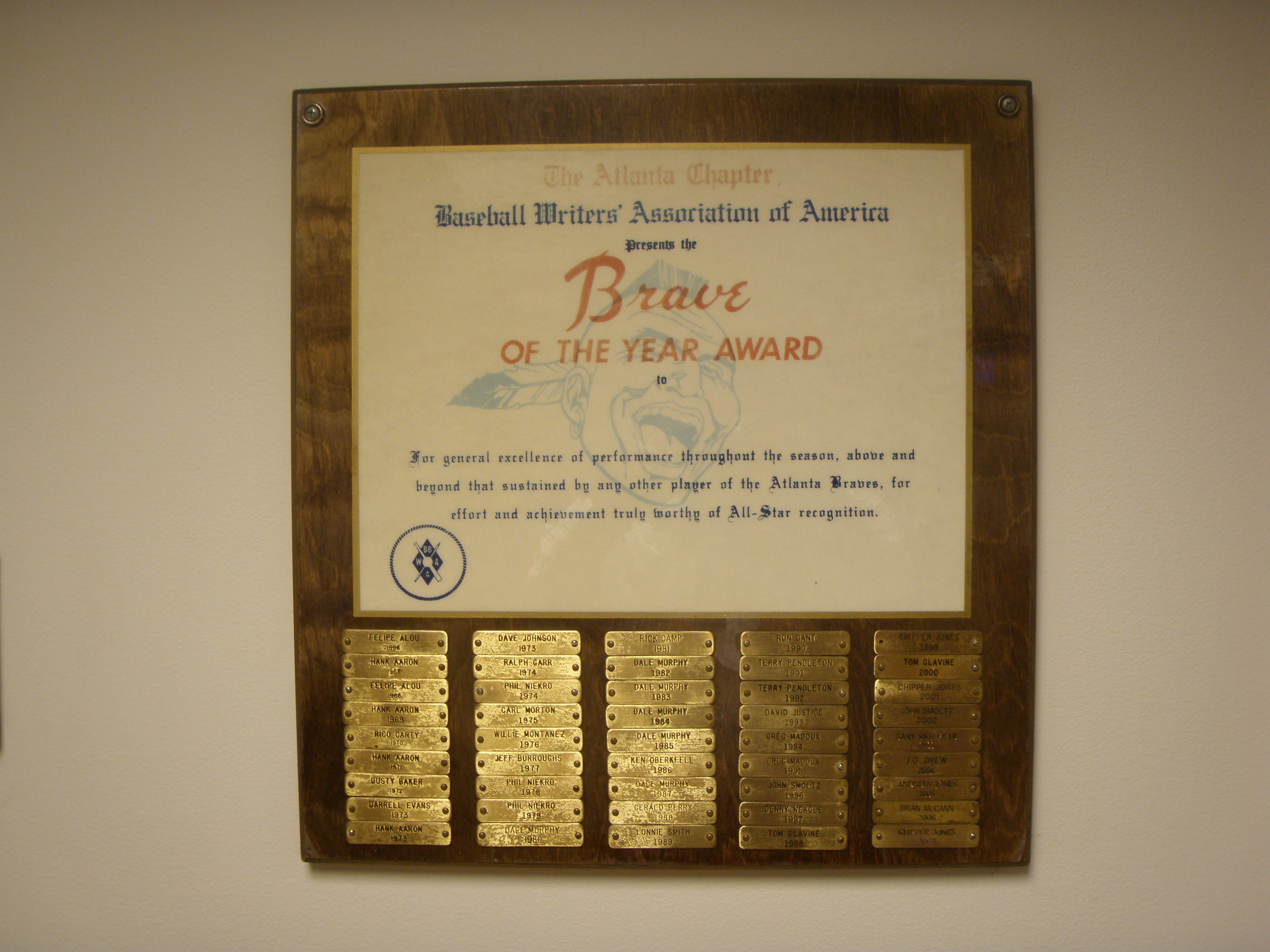 The 1972 Brave of the Year Award went to current Reds manager Dusty Baker. Baker hit .321 with 17hr and 76rbi for the ’72 Braves. This plaque hangs in the Turner Field press box, as it was awarded by the local press.