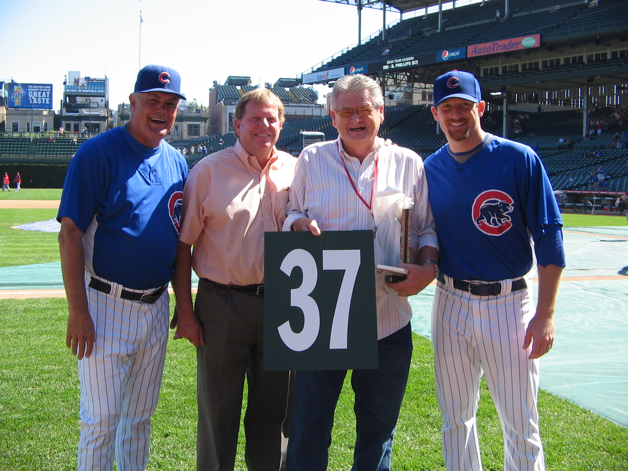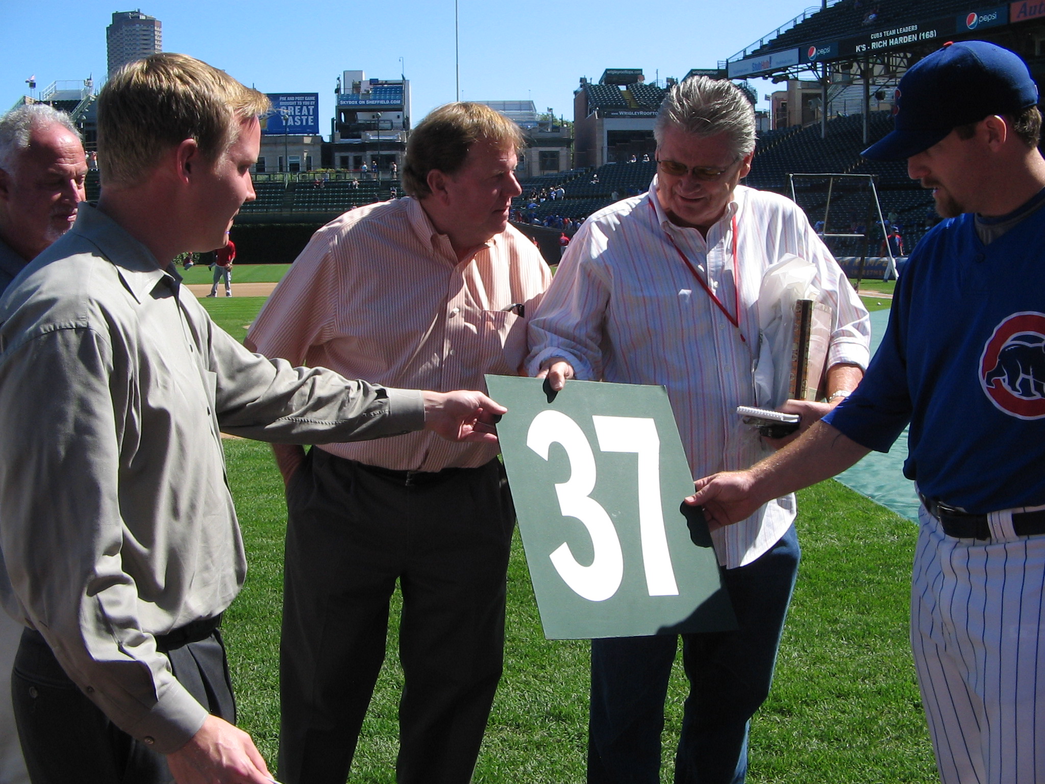 Cubs Director of Media Relations Peter Chase, left, presented Hal with the number 37 from the Wrigley Field scoreboard. They also gave McCoy wine and a box of cigars. Also pictured are Cubs Vice President and GM Jim Hendry, second from left, and former Red and current Cubs pitcher Ryan Dempster.