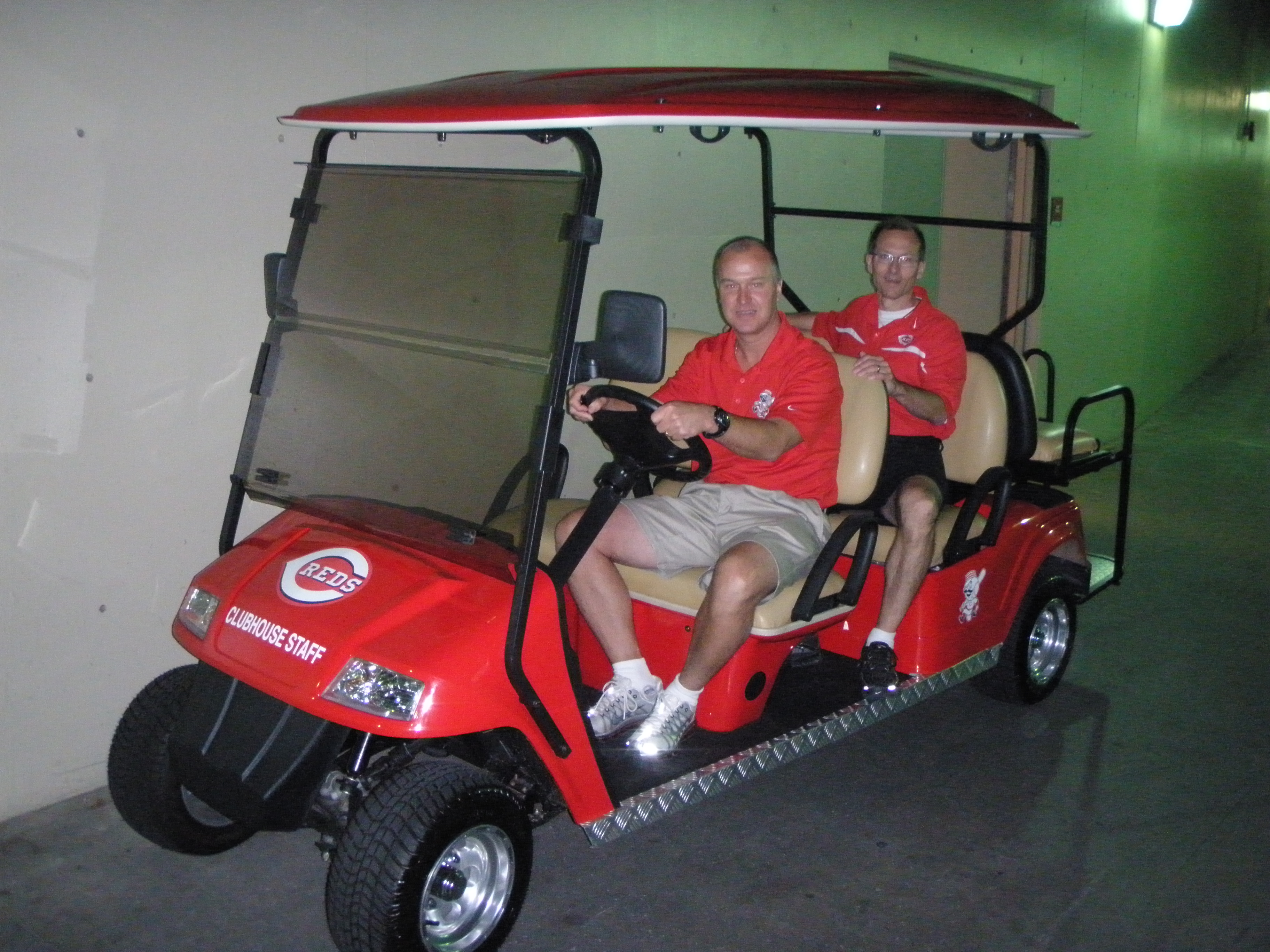 Today Reds RHP Aaron Harang presented the clubhouse staff with a 6-seat personalized golf cart for their exclusive use. Reds clubhouse and equipment manager Rick Stowe (front) and visiting clubhouse manager Mark Stowe (rear) already have ideas to enhance their new ride. They have already allocated a spot for their gift on the truck to Goodyear for use in Arizona this spring.