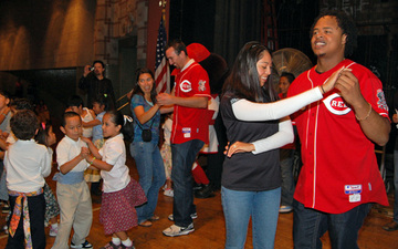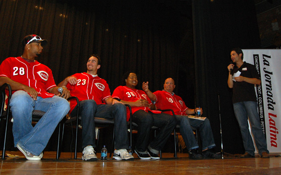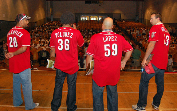 Bullpen coach Porky Lopez (#59) and players Edinson Volquez (#36), Wladimir Balentien (#28) and Adam Rosales (#23) on Friday visited Cincinnati Public School’s Academy of Multilingual Immersion Studies (AMIS) in association with La Jornada Latina newspaper…the school assembly was held in conjunction with Hispanic Heritage Night, scheduled for Saturday night.