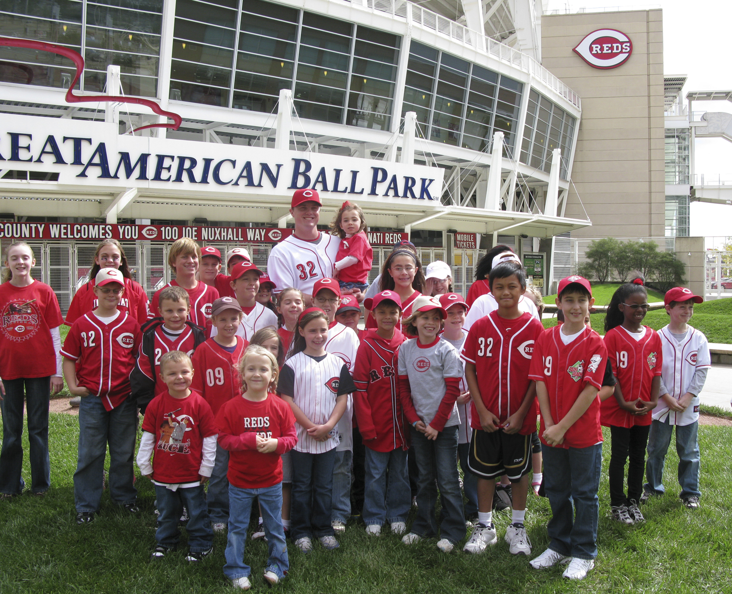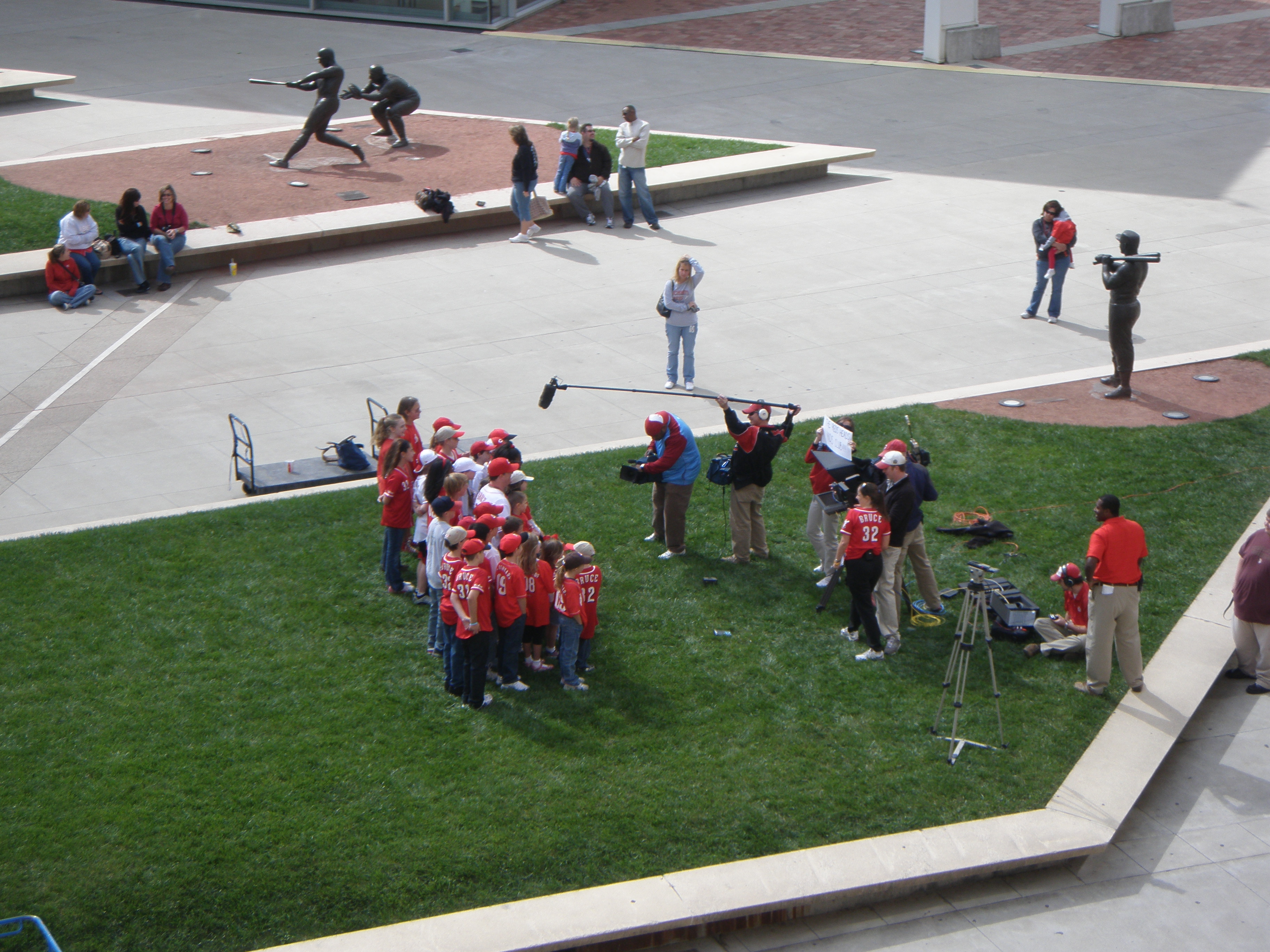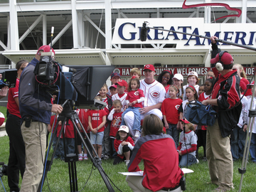 This afternoon, the Reds Heads Kids Club filmed a commercial with Kids Club captain Jay Bruce at Great American Ball Park’s Crosley Terrace. Starring in the commercial were 25 children and relatives of Reds employees.