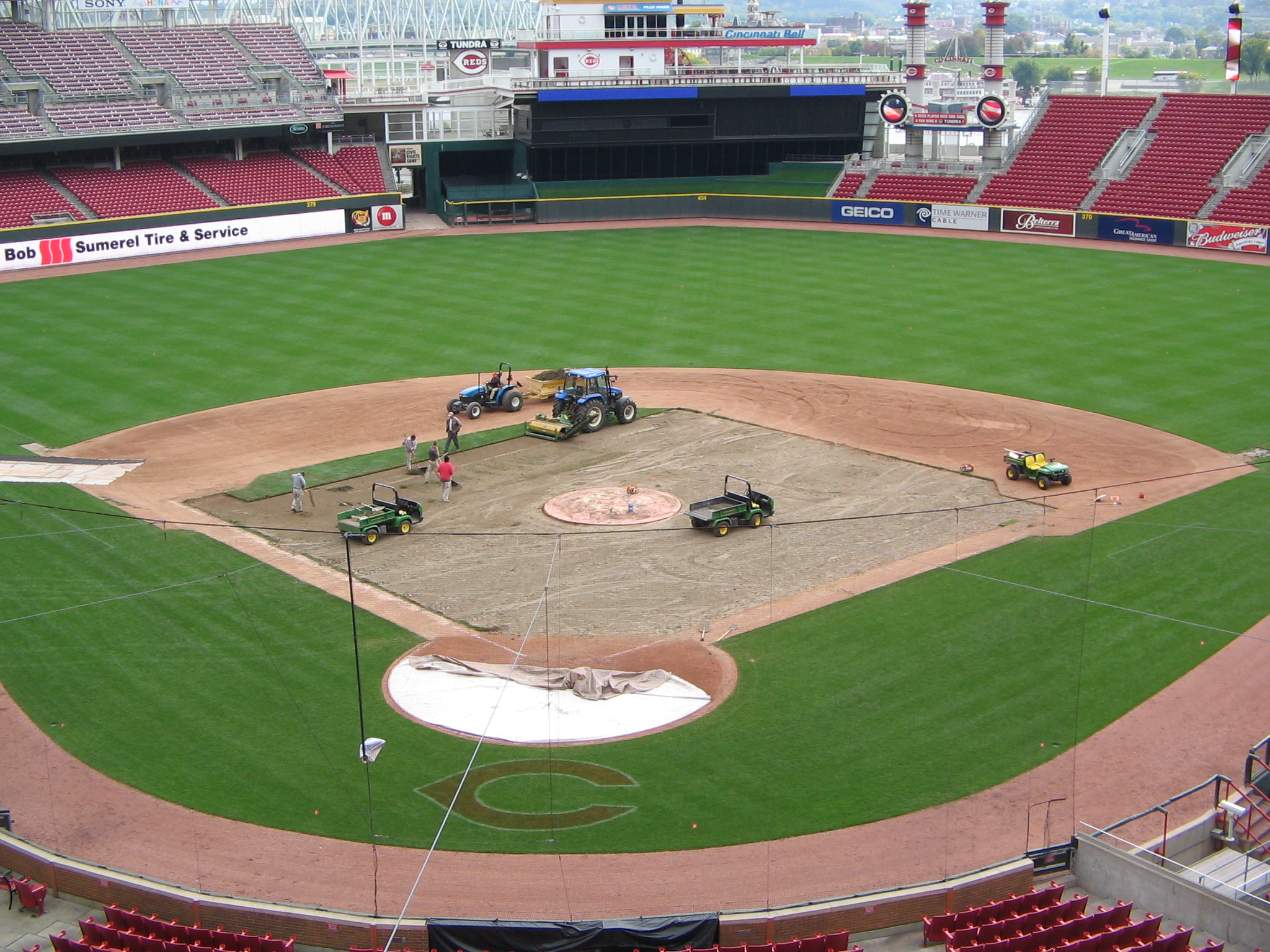 Today Reds head groundskeeper Doug Gallant and his crew removed the infield grass from the playing surface of Great American Ball Park. With the way it looks now, it’s still a step up from FieldTurf.