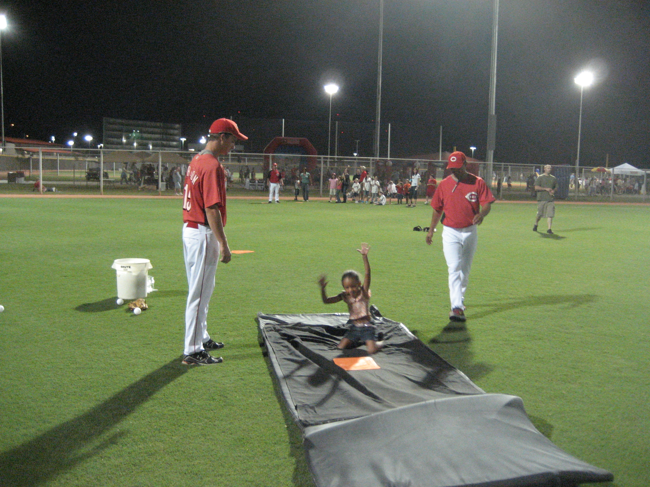 A young fan at the sliding station of the baseball clinic.