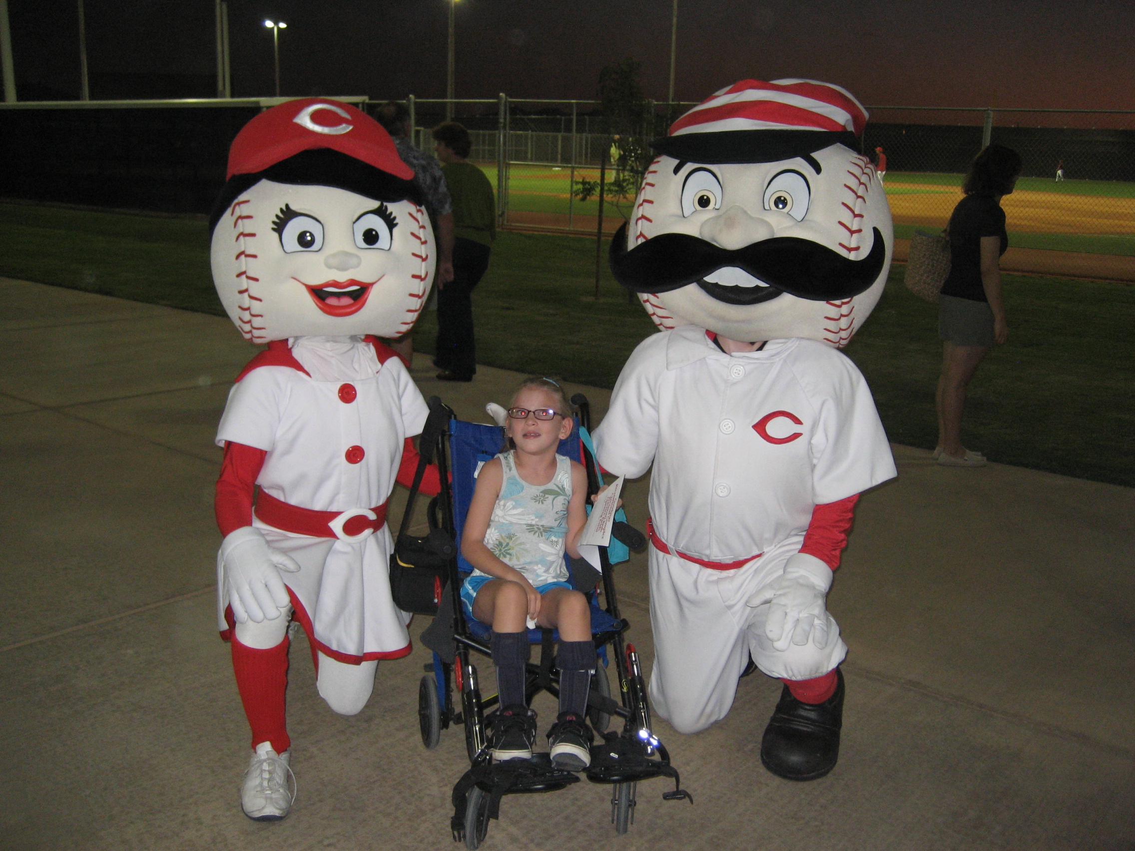 Rosie Red and Mr. Redlegs with a young fan at the club’s new spring training facility open house.