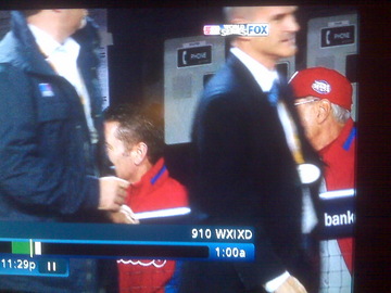 Last night, while working for Major League Baseball at the World Series, Reds director of media relations Rob Butcher (right, in suit) was captured on FOX TV’s broadcast immediately after Game 1. His post-game responsibilities were to take Phillies 2B Chase Utley to Mark Grace for his FOX live on-field interview, then to ESPN Radio and Phillies Radio where he also appeared live.