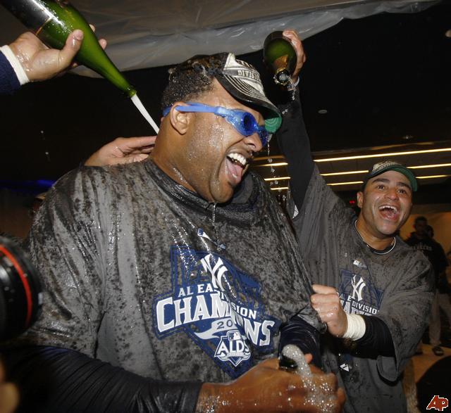 IF/OF Jerry “Bridge” Hairston Jr. is seen here celebrating with LHP CC Sabathia in the Yankees clubhouse following last night’s World Series Game 6. During the 2009 Postseason, Hairston batted .250 (2-for-8) and scored the winning run in the 13th inning of Game 2 of the ALCS vs LAA after his first career Postseason at-bat.