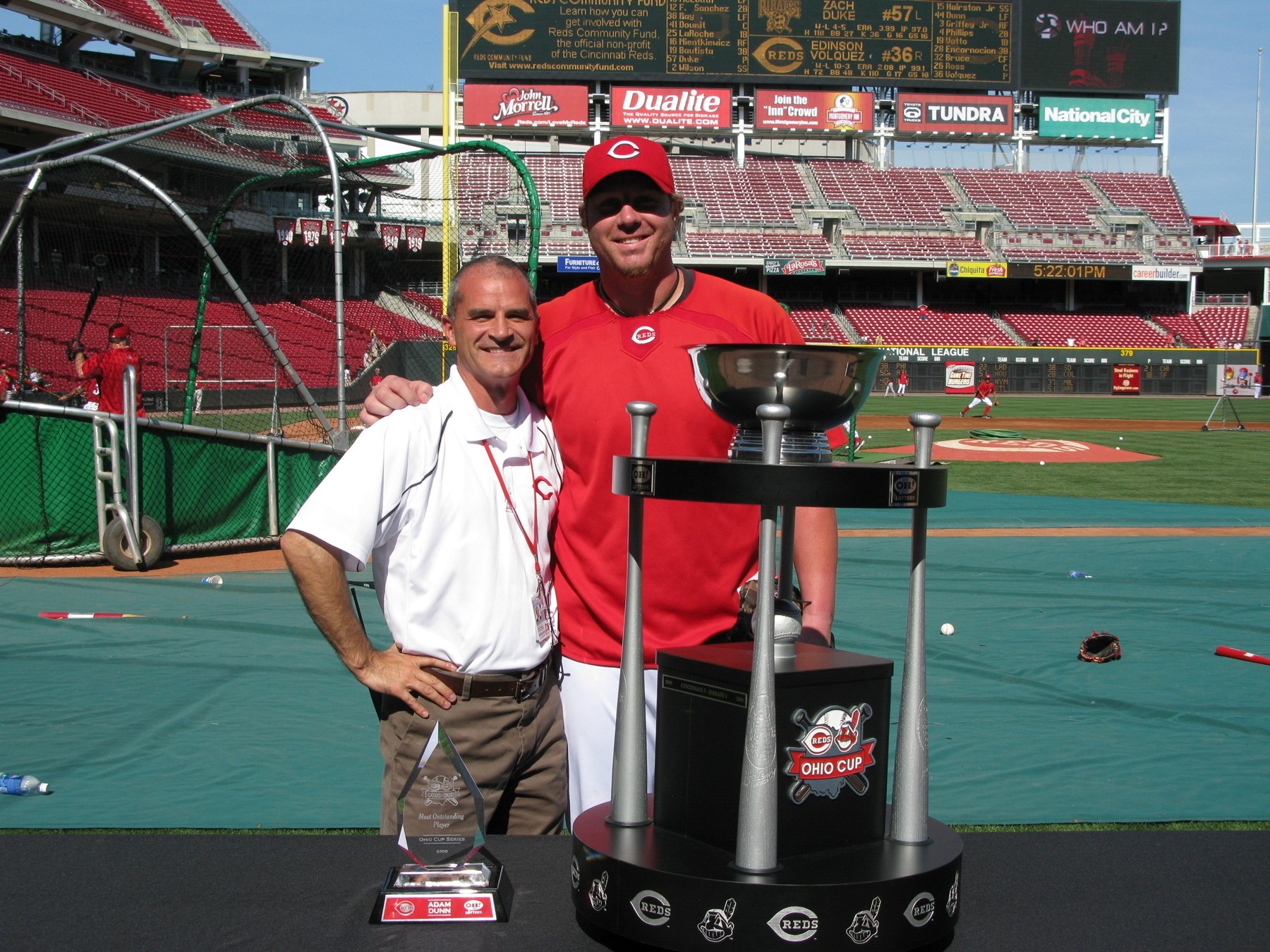 Pictured are Reds director of media relations Rob Butcher, left, and former Reds outfielder Adam Dunn, winner of the Ohio Lottery Most Outstanding Player award from last year’s Ohio Cup series between the Reds and Indians. Tonight the Reds and Indians kick off the 13th season of interleague games. The Reds won the 2008 season series vs the Indians and along with it the coveted Ohio Cup trophy, presented by The Ohio Lottery. The Reds went 5-1 vs Cle last season, including a 3-game sweep at Great American Ball Park in May and a 2-1 series victory in June at Progressive Field. Dunn received the series’ Ohio MOP award after hitting .300 (6-20) and leading all players with 5hr and 10rbi.