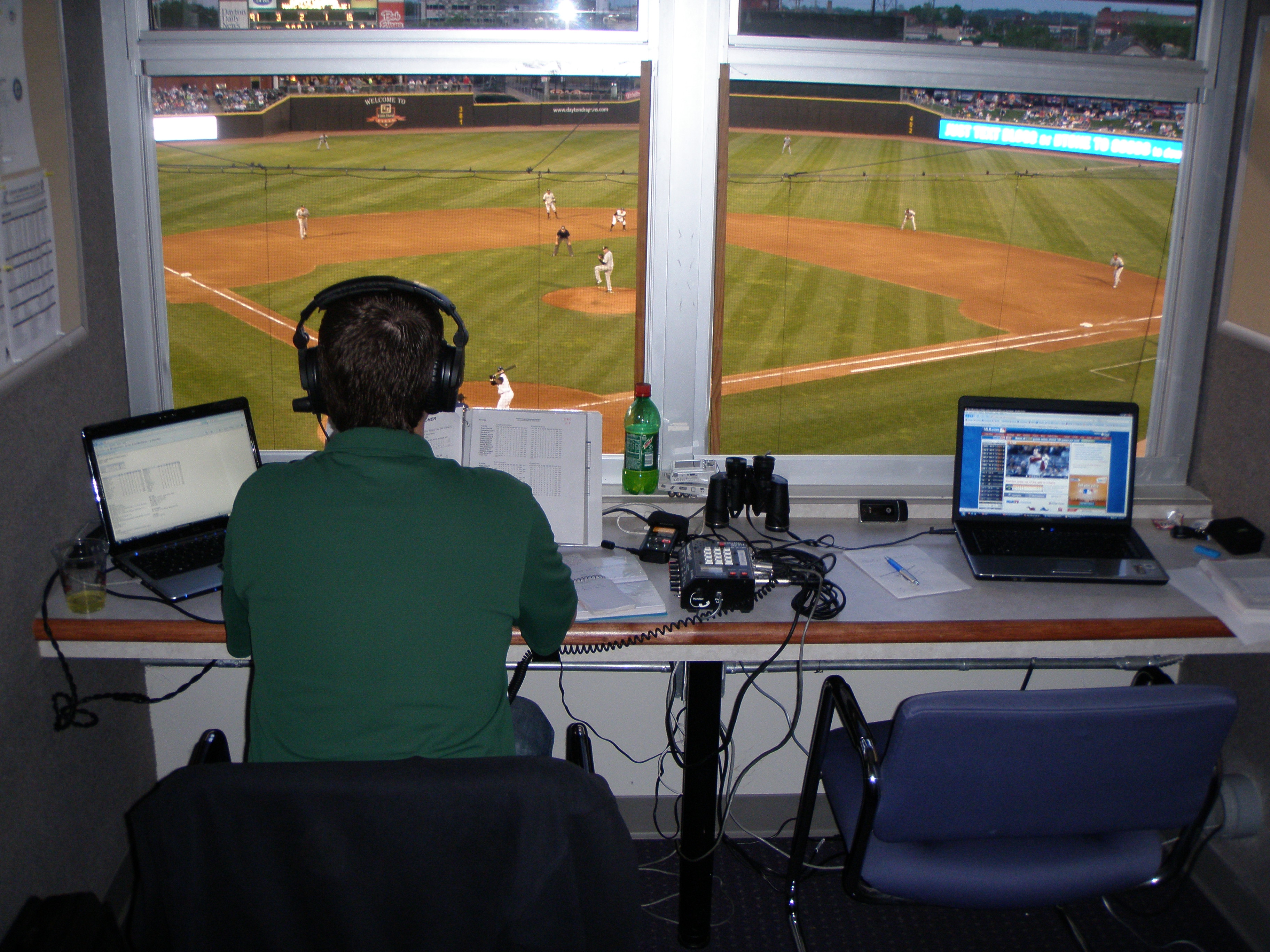 This is the visiting radio booth in Dayton. Seen on the left is my friend Dave Lezotte of the Clinton LumberKings hard at work. I took some heat by wearing my Reds jacket while coming out of the visiting radio booth.